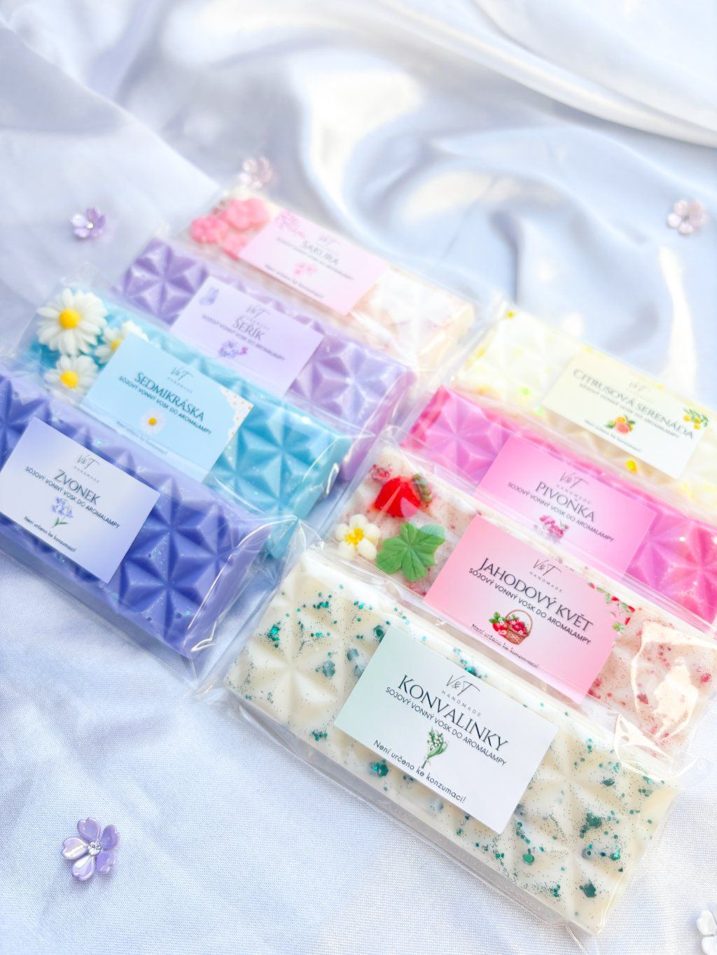 Zvýhodněný jarní set obsahuje vosky Sedmikráska, Jahodový květ, Šeřík, Pivoňka, Konvalinky, Citrusová serenáda, Zvonek, Sakura.