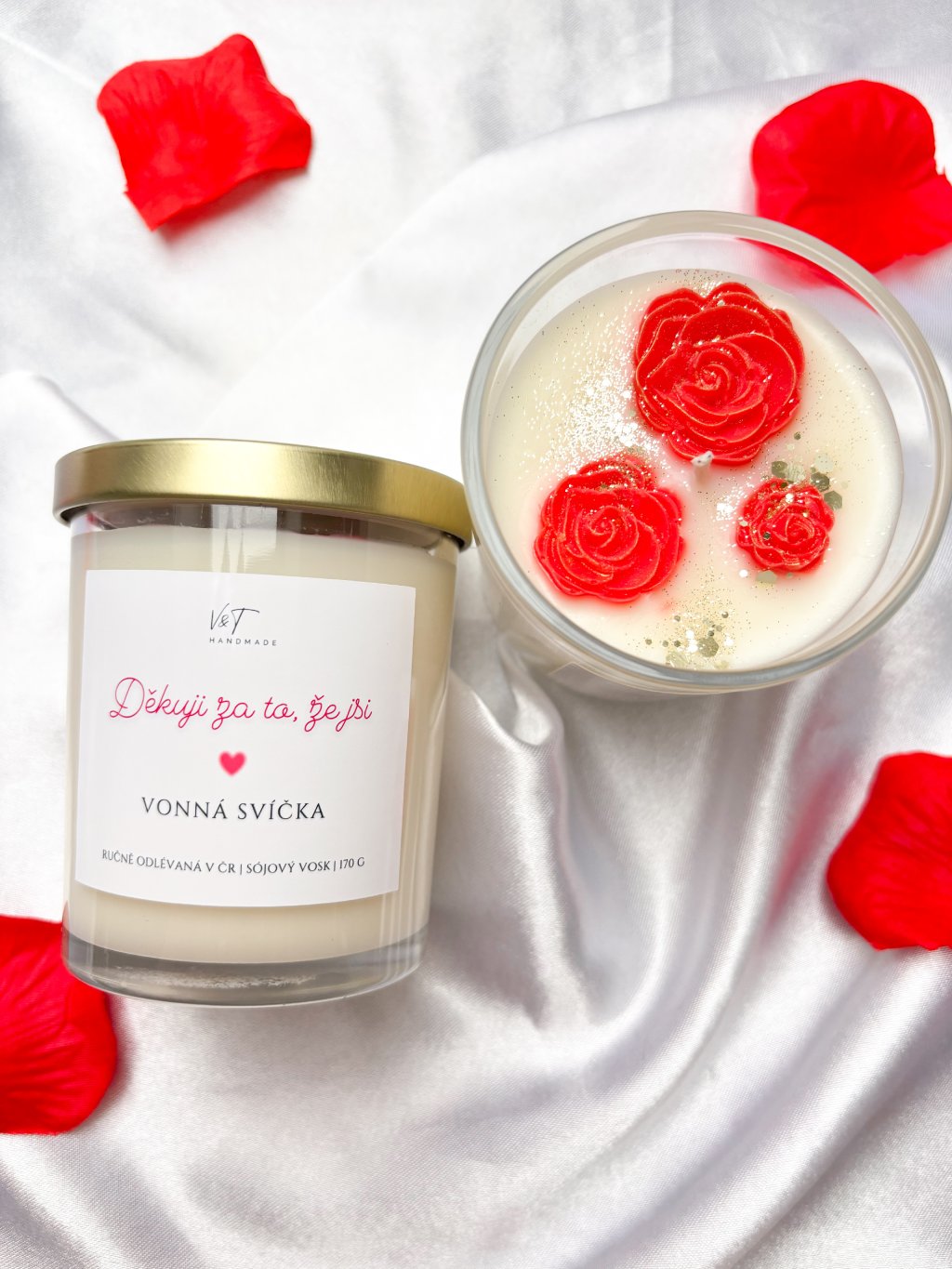 Hledáte originální dárek, který řekne víc než tisíc slov? Tato ručně litá svíčka s osobním věnováním, zdobená třemi voskovými růžemi, jemným zlatým prachem a třpytkami je dokonalým spojením luxusní dekorace a emotivního zážitku.