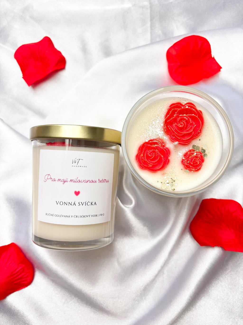Hledáte originální dárek, který řekne víc než tisíc slov? Tato ručně litá svíčka s osobním věnováním, zdobená třemi voskovými růžemi, jemným zlatým prachem a třpytkami je dokonalým spojením luxusní dekorace a emotivního zážitku.