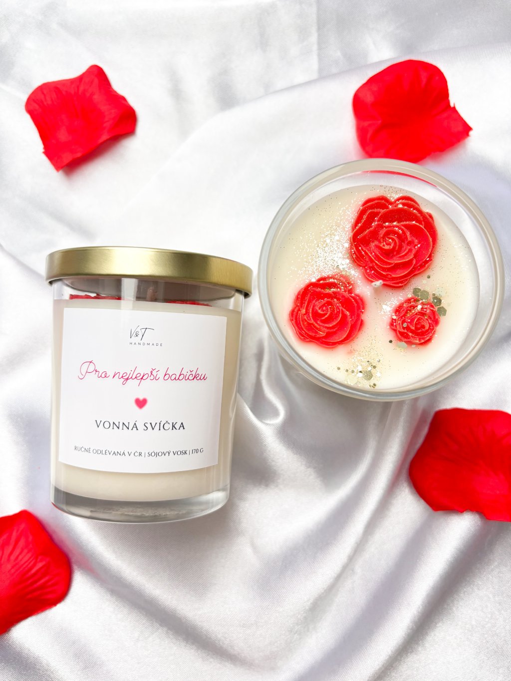Hledáte originální dárek, který řekne víc než tisíc slov? Tato ručně litá svíčka s osobním věnováním, zdobená třemi voskovými růžemi, jemným zlatým prachem a třpytkami je dokonalým spojením luxusní dekorace a emotivního zážitku.