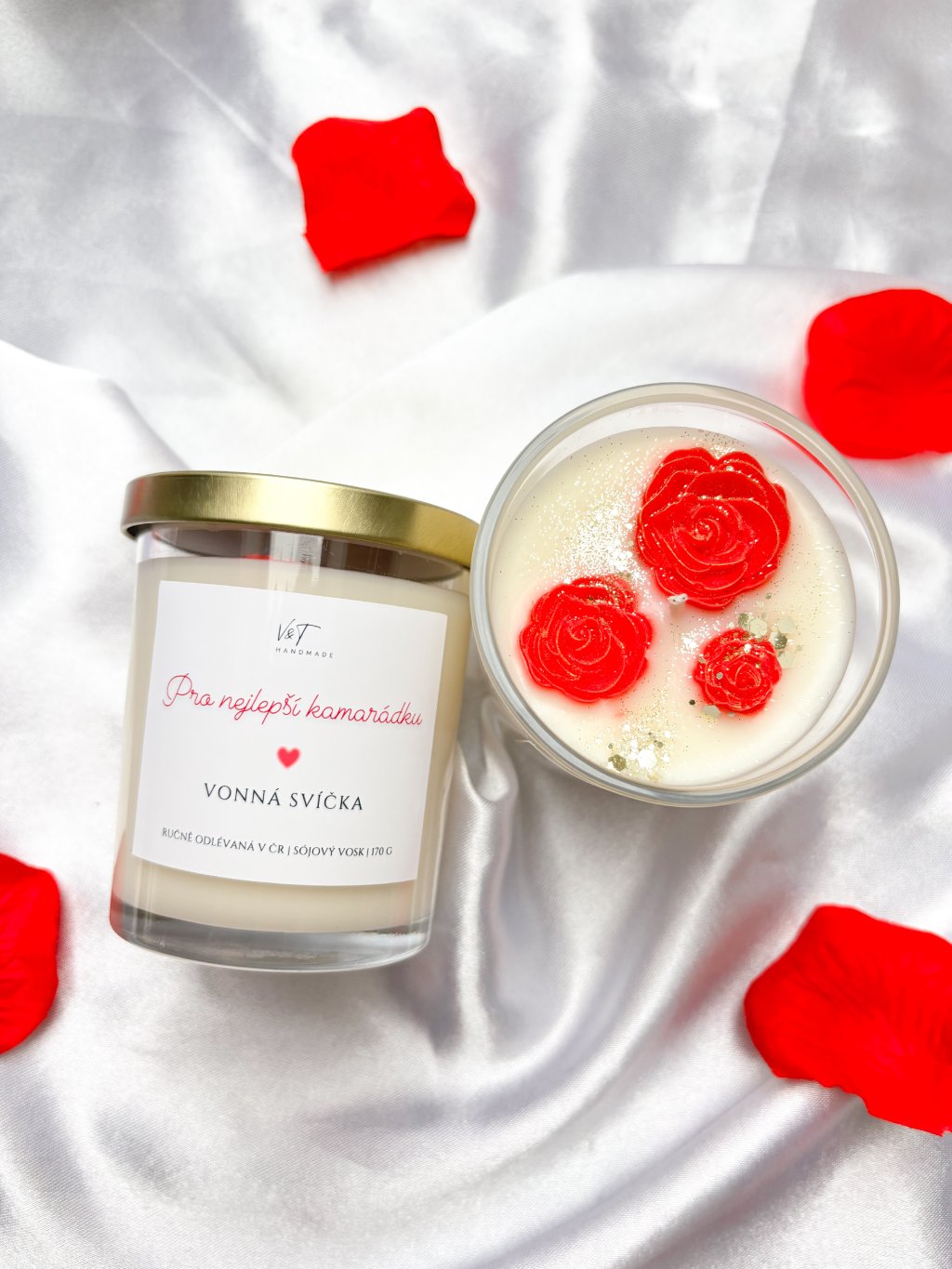 Hledáte originální dárek, který řekne víc než tisíc slov? Tato ručně litá svíčka s osobním věnováním, zdobená třemi voskovými růžemi, jemným zlatým prachem a třpytkami je dokonalým spojením luxusní dekorace a emotivního zážitku.