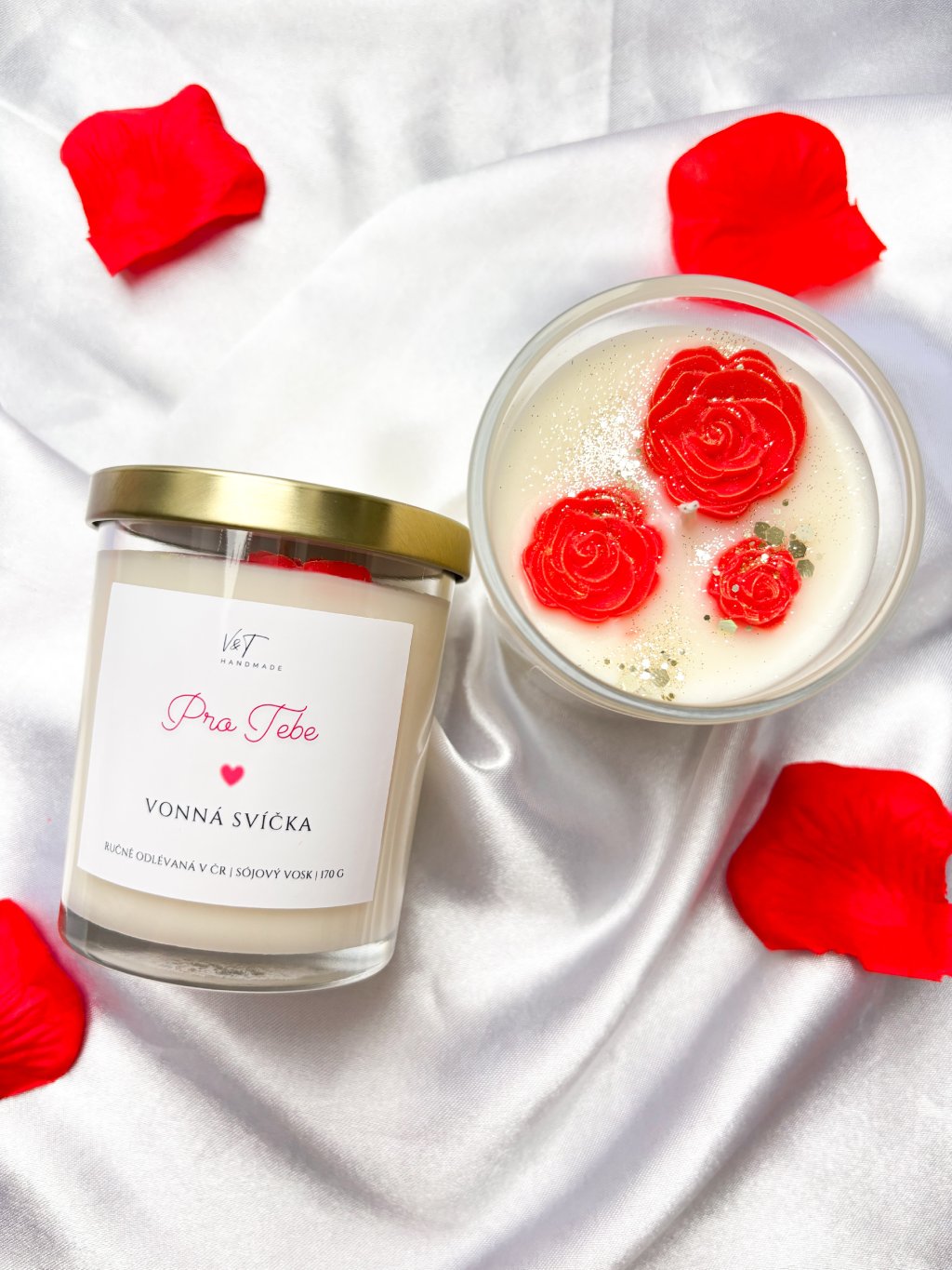 Hledáte originální dárek, který řekne víc než tisíc slov? Tato ručně litá svíčka s osobním věnováním, zdobená třemi voskovými růžemi, jemným zlatým prachem a třpytkami je dokonalým spojením luxusní dekorace a emotivního zážitku.